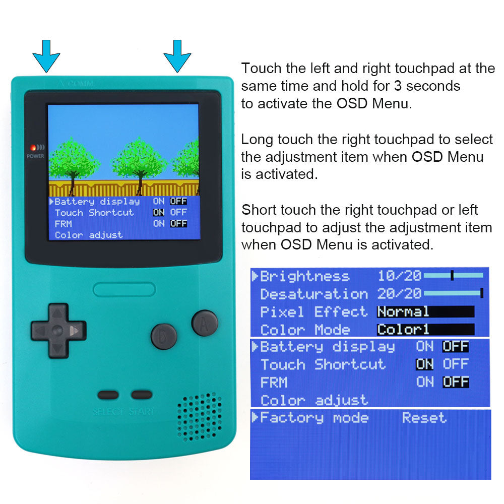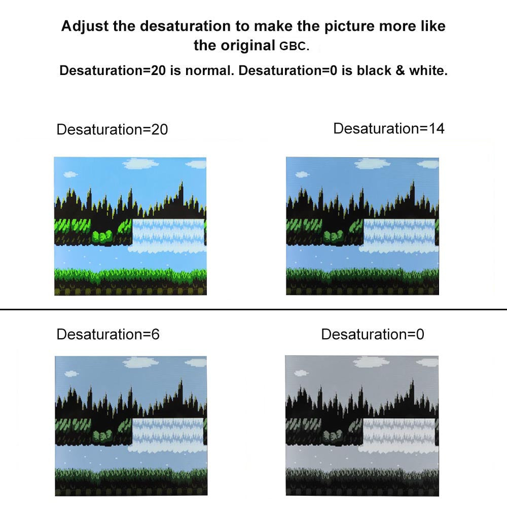 7. Desaturation. This function can make the color of IPS LCD images closer to the original color of GBC games.Note: ‘Desaturation’can only be adjustable in normal color mode.